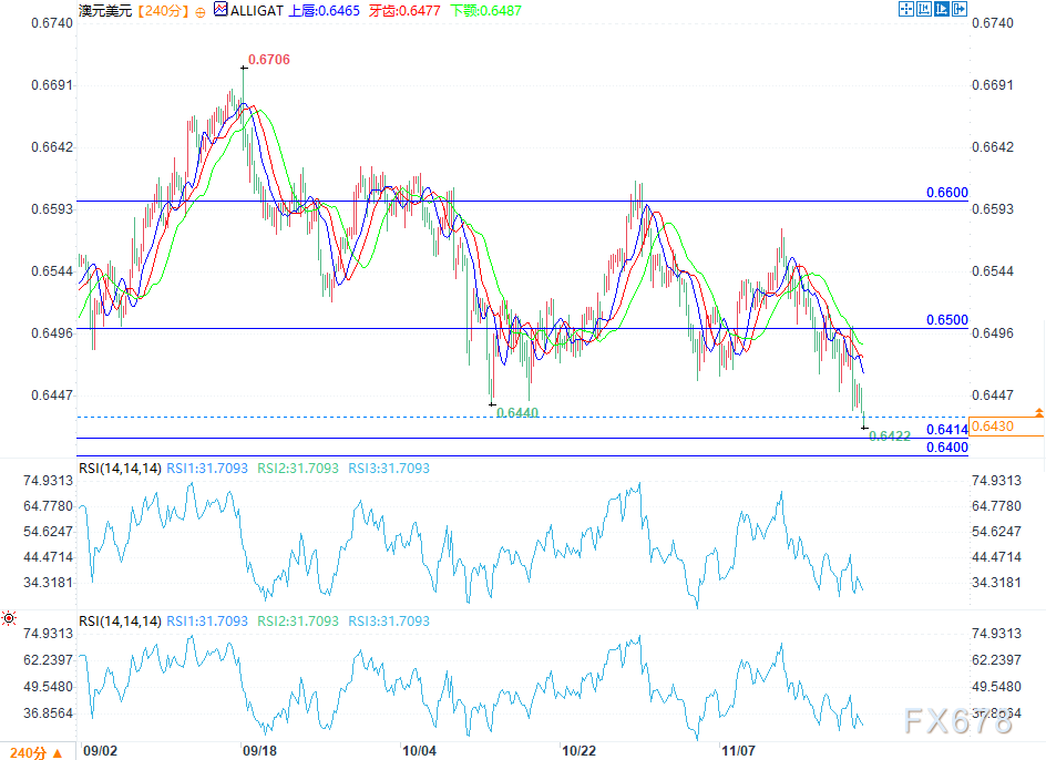 周五(11月21日)欧盘时段,由于美国劳动力市场统计数据公布后美元走强,澳元/美元汇率盘中下跌至0.6430附近。