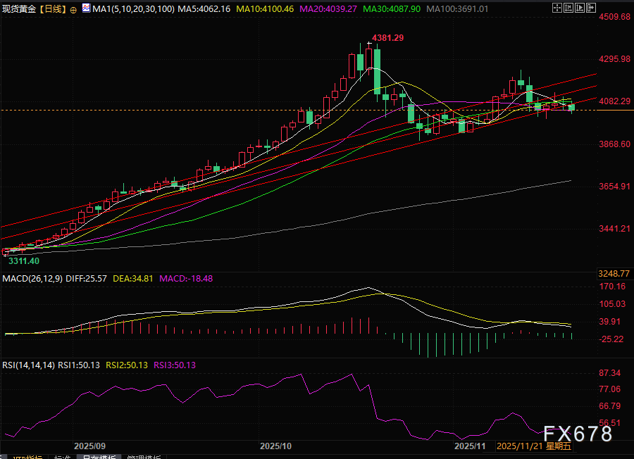 周五(11月21日)亚欧时段,黄金价格小幅下探打破了上个交易日的震荡格局跌,昨天的非农数据影响表面优于预期,但实际充满了劳动力市场恶化的细节,小幅提振了黄金走势。但昨日美股市场高开冲高大幅回落,叠加亚洲股市整体暴跌影响了市场风险偏好带动黄金一起下跌。