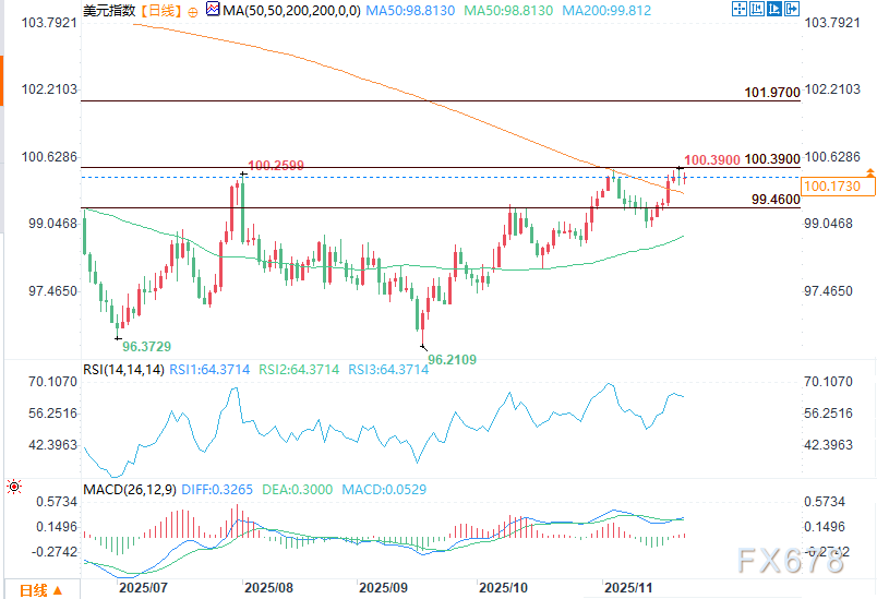 周一(11月24日)美盘时段,美国国债收益率走低,拖累美元同步承压:10年期国债收益率跌至4.046%,削弱了通常支撑美元走强的收益优势;30年期收益率降至4.683%,2年期收益率维持在3.512%附近——短端收益率虽保持稳定,但长端收益率下行进一步削弱了美元的支撑力。