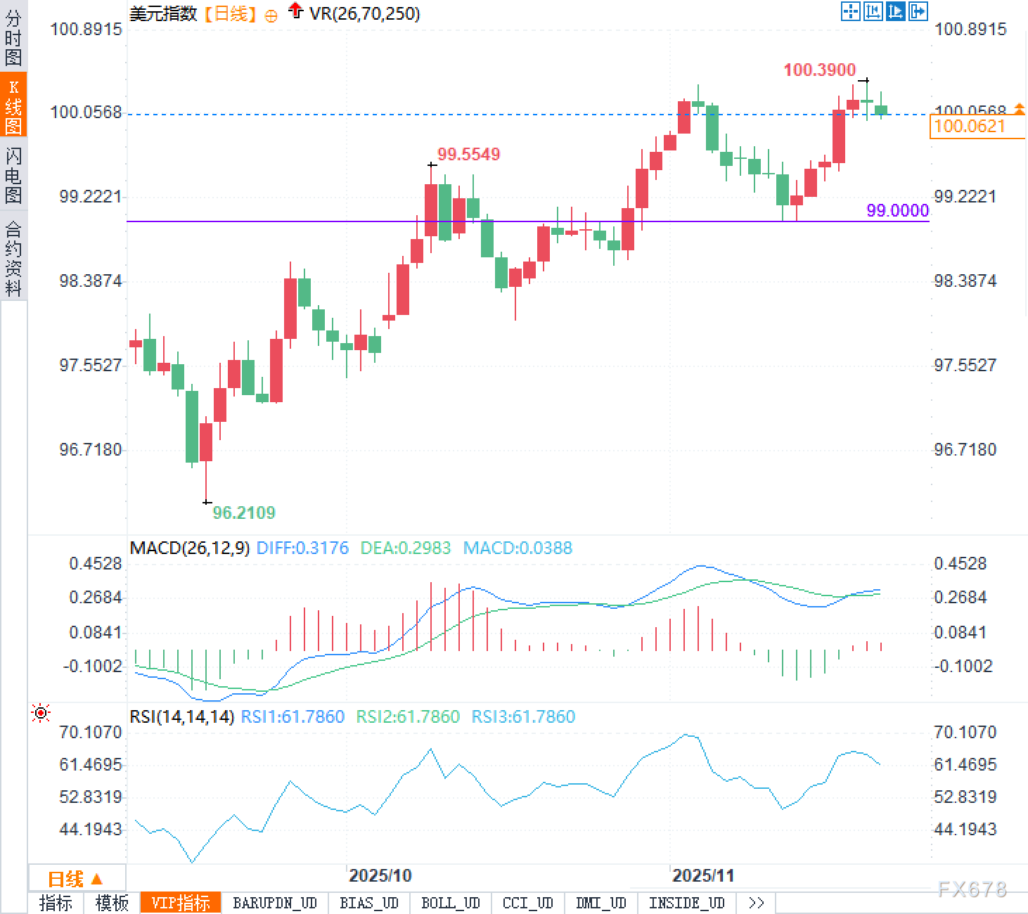11月24日,星期一。美元指数北美时段交投于100关口略微上方,处于近期震荡区间的中轴位置。尽管美联储多位官员相继释放鸽派信号,推动市场对12月降息的预期升温,但美元并未出现显著走弱,反而在部分时段表现出韧性。