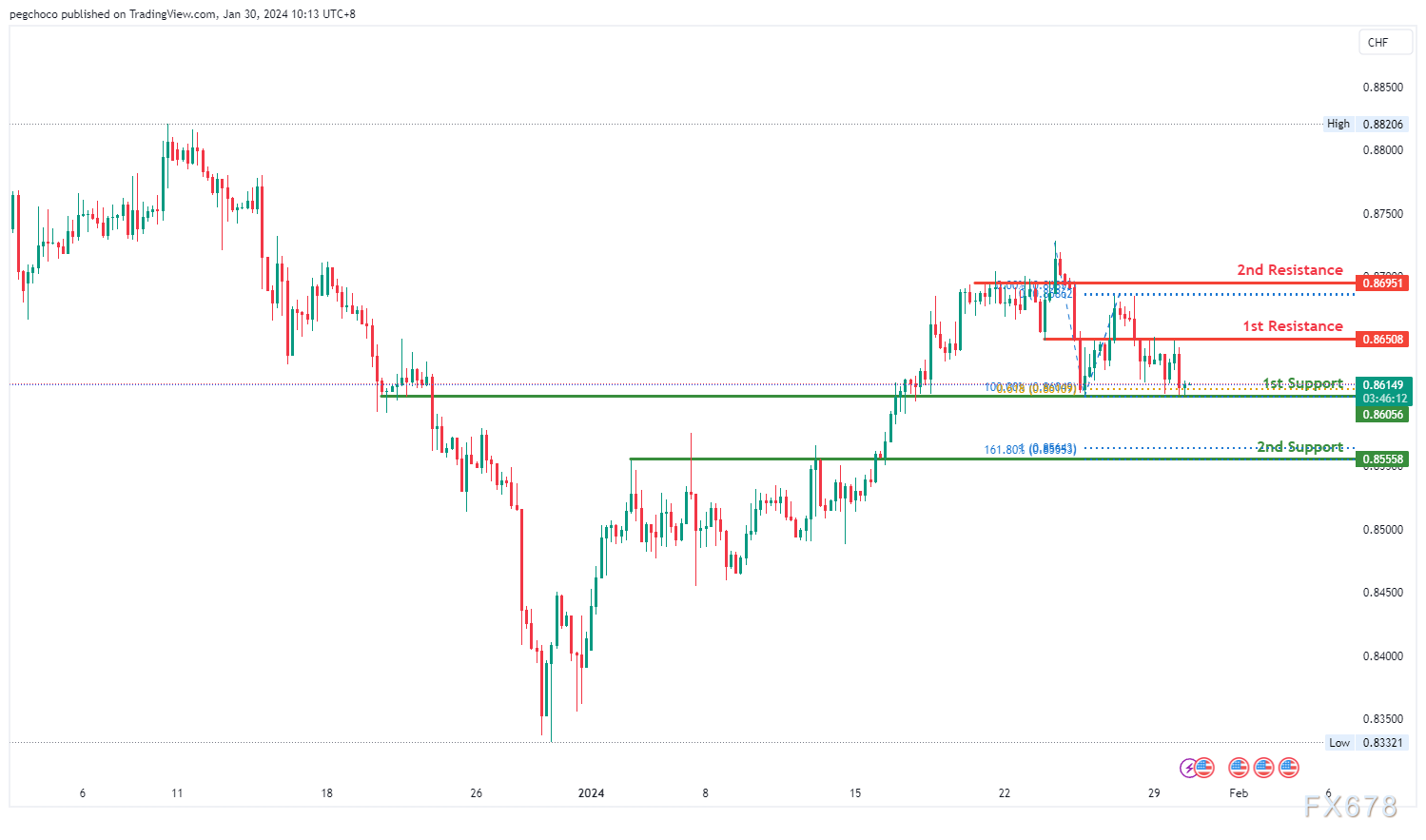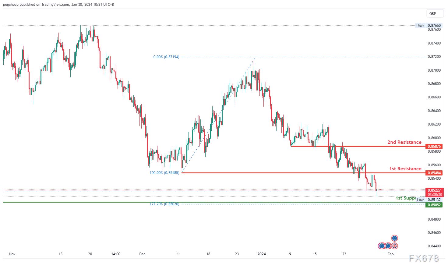 第二个阻力位0.8587也被确定为重叠阻力位,进一步强调其作为重要阻力位的潜在作用。