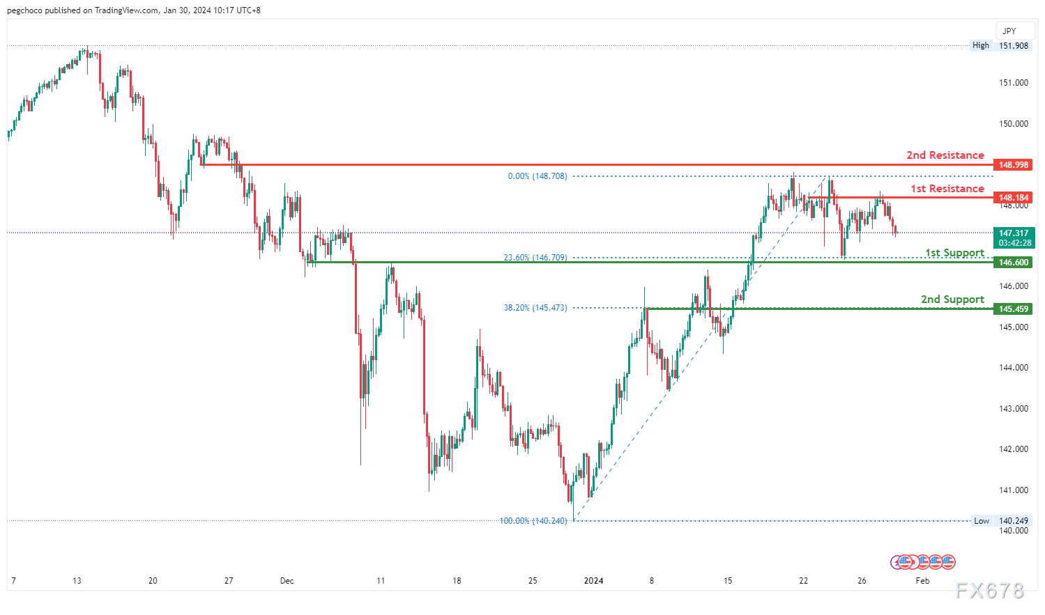 第二个支撑位145.45为回调支撑位,与38.20%斐波那契回撤位相关,进一步强调了其作为潜在支撑区域的重要性。