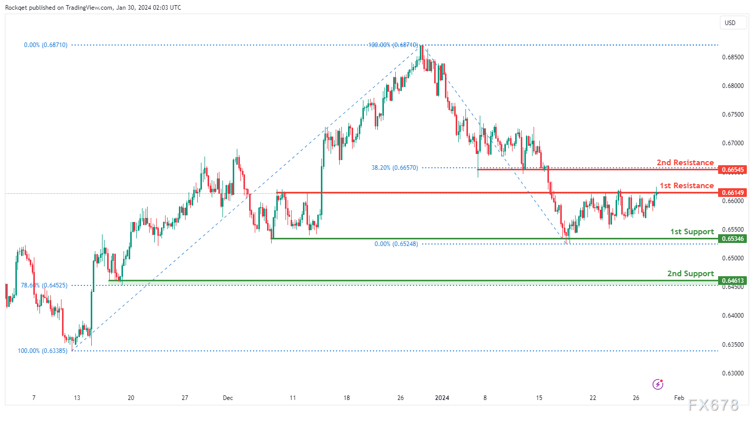 第二个阻力位0.6654被确定为回调阻力位,并与38.20%斐波那契回撤位相关联,表明它是另一个重要的阻力位。