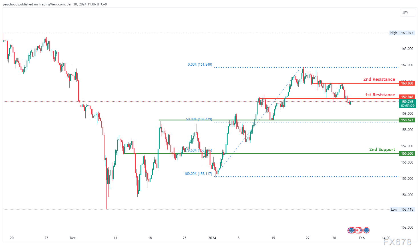 在阻力位方面,第一个阻力位159.94为回调阻力位,表明它是价格过去遇到阻力的历史点位。