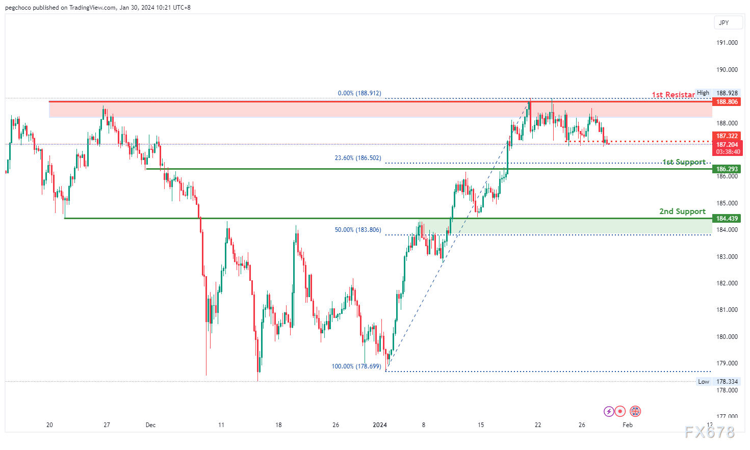 中间阻力位187.320,为回调阻力,可能在阻碍向上运动中发挥作用。