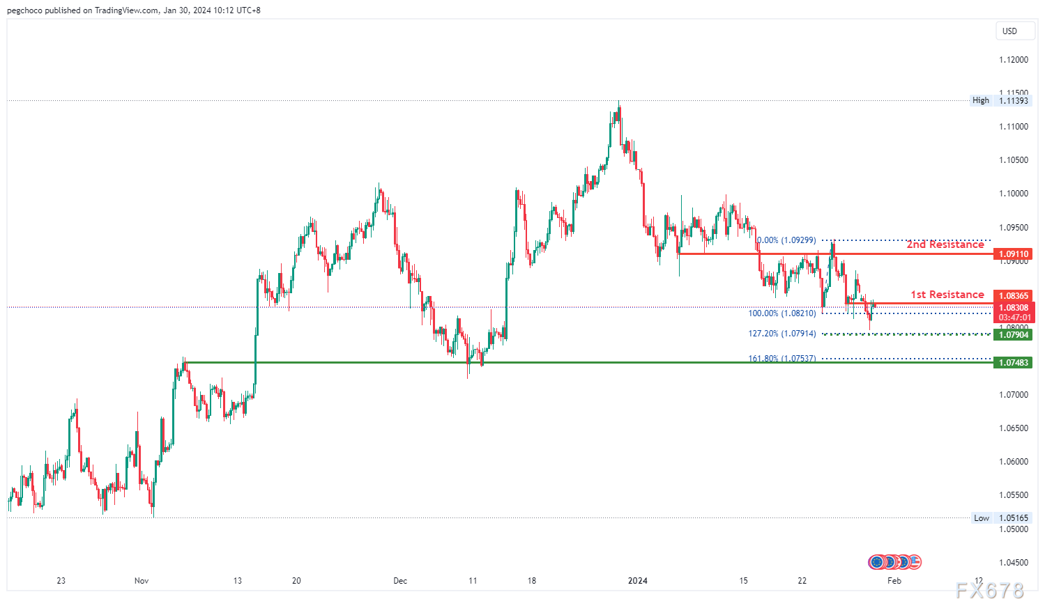 第一个支撑位1.0748被确定为重叠支撑位,与161.80%斐波那契扩展位一致。这一点位代表了一个重要的历史支撑位,斐波那契扩展增加了它作为潜在支撑位的重要性。
