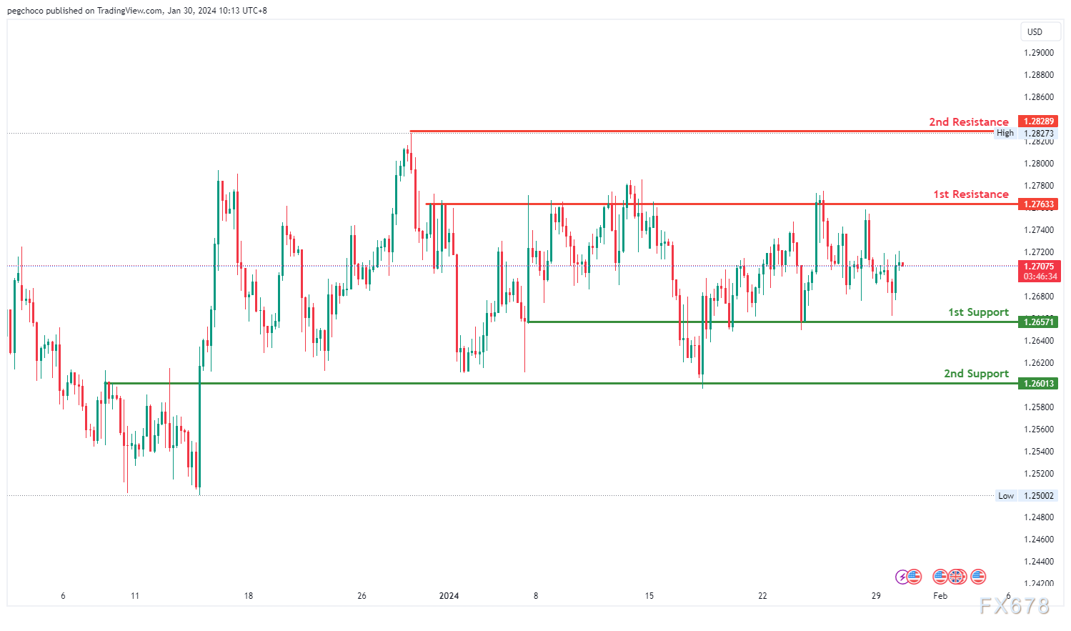 在阻力位方面,第一个阻力位1.2763为多波段高阻力位,表明它代表了过去价格遇到阻力的历史点位。
