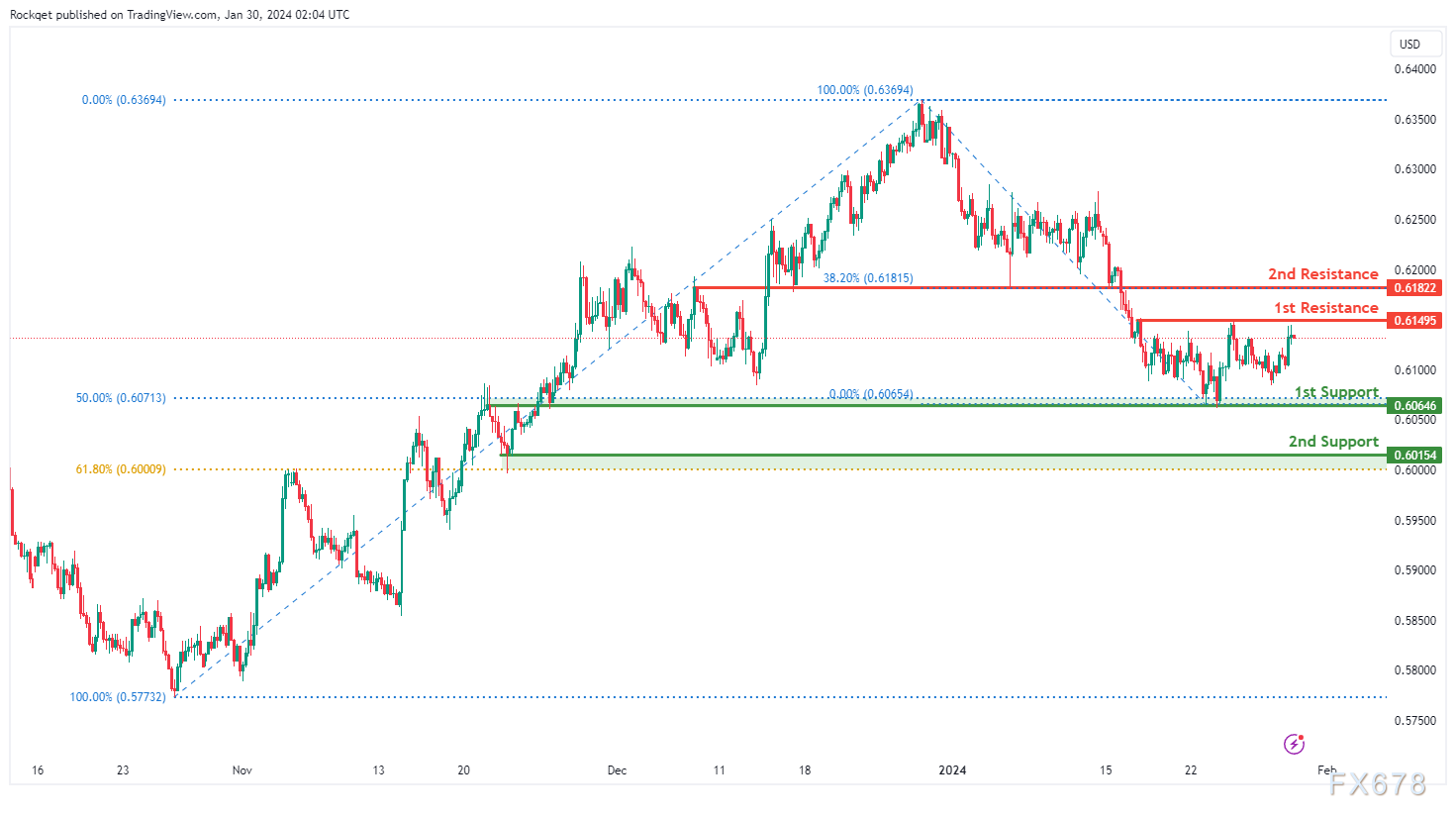 第二个阻力位在0.6182被确定为回调阻力位,并与38.20%斐波那契回撤位相关联,这表明它是另一个重要的阻力位。