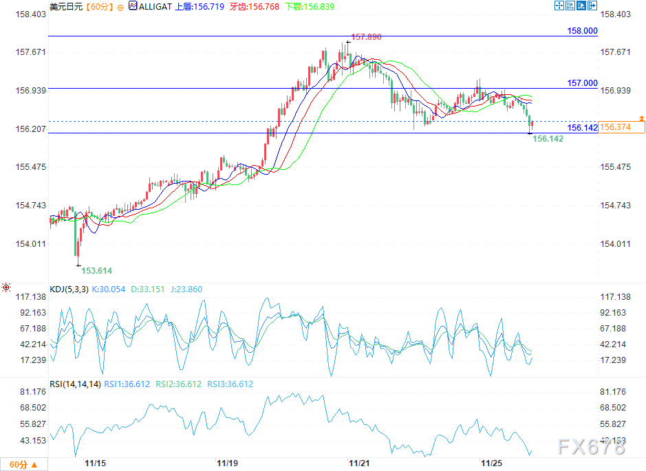 周二(11月25日)欧盘时段,美元/日元汇率走低,主要因市场猜测日本当局可能采取干预措施支撑本币。美元/日元日内先冲高至157.0附近,随后震荡下行,尾盘下探至156.28的日内低点,整体呈“冲高回落+弱势震荡”格局。