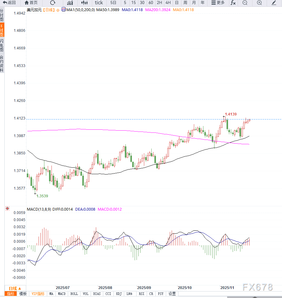 尽管基本面显示美元疲弱,但加元因油价走低而无法强势反攻,使USD/CAD短线进入典型的“高位震荡”。