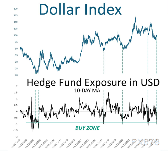 分析师吉列尔梅·塔瓦雷斯重点解读了这一格局,并警示交易拥挤度已达危险水平。他在报告中写道:“对冲基金持有大量美元指数空头头寸(即多头头寸狂减),从历史数据来看,类似头寸水平往往孕育着稳健的买入机会——至少是短期反弹机会。当一项交易拥挤度达到极致时,反向操作通常具备交易价值。”