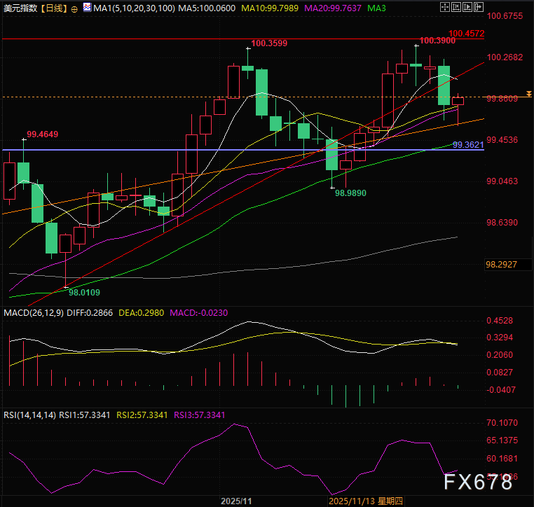 周三(11月26日)亚欧交易时段,美元指数走出多次探底回升的宽幅震荡走势,目前交投于99.79附近,受数据影响交易员对美国12月降息预期的持续升温推动美元早盘继续探底,同时俄乌和平协议签署协议延后的消息以及空头头寸增仓过猛后多头的回补又提振了美元指数,最后在英国超预期财政预案和美国数据影响下继续宽幅震荡。