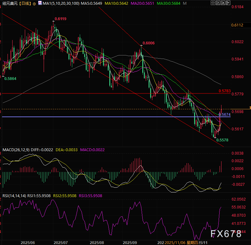 周四(11月27日)纽元对美元继续保持反弹格局,汇价连续两天反弹超过1.5%,目前交投于0.5711,涨0.25%。