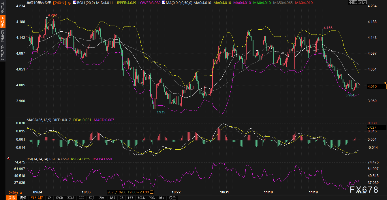 若未出现突发地缘或政策事件,市场将延续当前技术面指引,10年期收益率在3.98%-4.04%区间波动。布林带中轨与MACD金叉形成短期支撑,但感恩节后流动性恢复缓慢可能抑制突破动能。