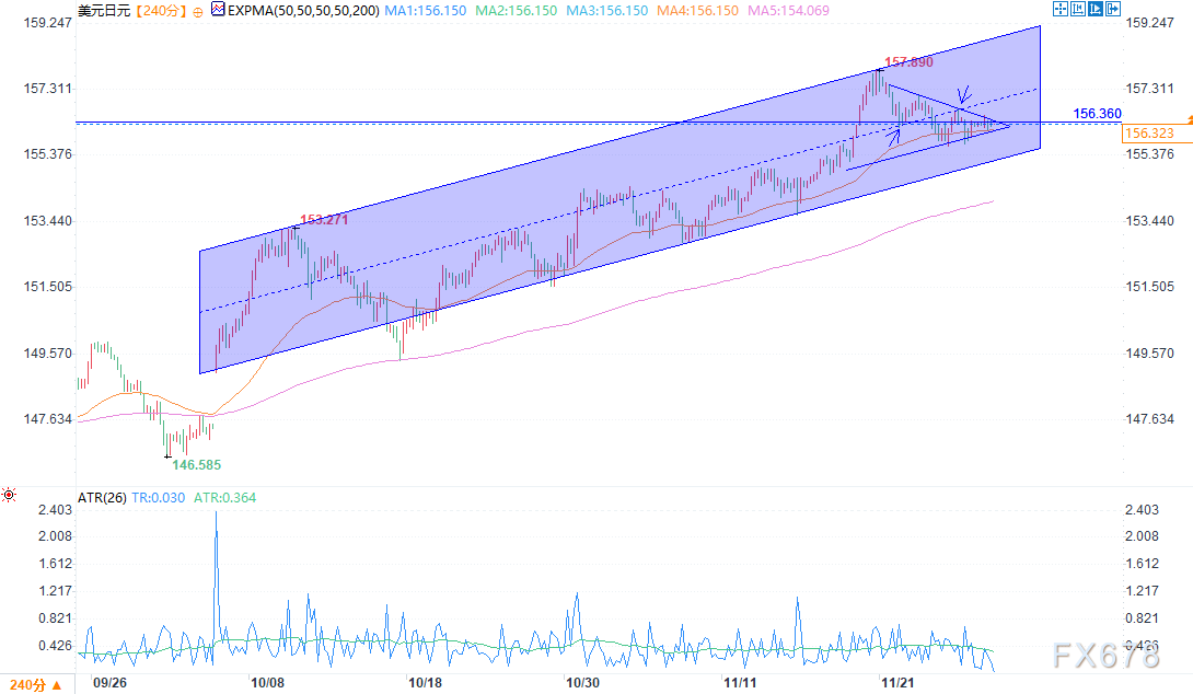 在全球外汇市场的多空博弈中,美元/日元汇率近期呈现窄幅震荡态势,目前已企稳于156.300关键水平附近。从技术指标来看,平均真实波幅(ATR)指标持续处于近期低位区间,且整体保持下行趋势。这一现象的背后,既与美国感恩节假期带来的市场交易节奏放缓直接相关——假期期间不少机构投资者选择离场观望,市场资金活跃度显著降低,买卖盘力量相对均衡;更反映出当前外汇市场参与者的谨慎心态,面对多重交织的影响因素,交易者正全面权衡利弊,暂未形成明确的方向性共识。