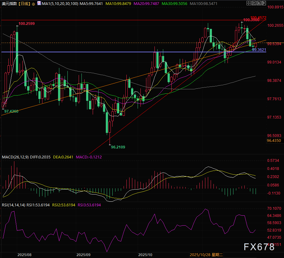 周五(11月28日)亚欧时段美元指数小幅反弹,近期呈现明显弱势,目前指数围绕99.58一线微涨0.05%,但本周累计跌幅已达0.60%,即将创下自7月以来的最大单周跌幅。此前该指数在一周前刚触及六个月高点,短短数日内的快速回落,凸显市场对美元的看空情绪升温,这也是美元四个月来最陡峭的单周下行行情,本文罗列了近期兑美元指数影响较大的一些因素。
