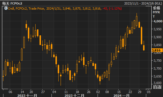 棕榈油的贸易货币马来西亚林吉特美元汇率下跌0.09%,由于经济数据强劲,美联储不会比预期更早降息,这提振了马来西亚林吉特的汇率。