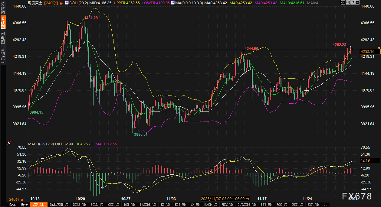 技术面上,现货黄金240分钟图呈现强劲的突破上涨形态。金价已强势突破布林带上轨(4262.76),并成功站上11月13日高点,显示出强烈的多头动能。MACD指标中DIFF与DEA线均在零轴上方高位运行,且DIFF(33.02)远高于DEA(26.72),红色动能柱扩张,确认了短期上涨趋势的强化。目前价格已脱离布林带常规轨道,进入超买区域,但动能尚未衰竭。