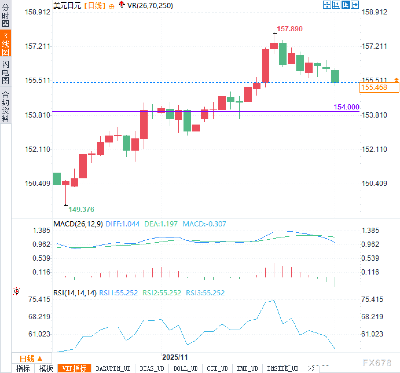 另一方面,美元面临的压力主要源于美联储政策前景的再定价。尽管美国经济基本面仍具韧性,但近期多位美联储官员发表的讲话偏向谨慎,强调需关注通胀回落进程以及劳动力市场的潜在疲软迹象,这使得市场对12月再次降息的预期再度升温。联邦基金利率期货显示,年内再度降息25个基点的概率已升至八成以上。在此背景下,美元指数承压下行,接近两周以来最低水平。美债收益率同步走低,尤其是短端利率下行更为明显,进一步压缩了美日之间的利差空间。