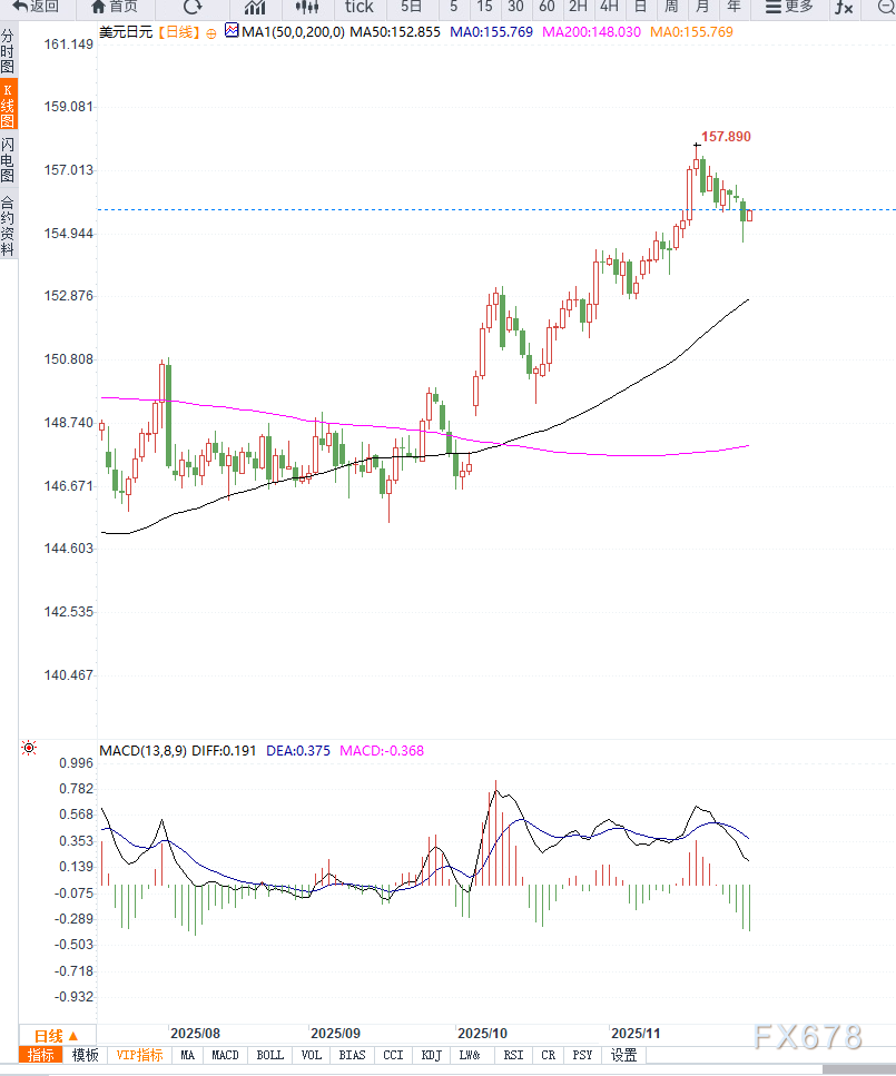 从日线结构观察,美元兑日元自 158.00 高点回落后,持续在下降通道内震荡整理。周一在 154.70 区域获得强劲支撑,该区间不仅是 11 月涨势的 61.8% 回撤位,也是下降通道下轨所在位置,技术意义极强。