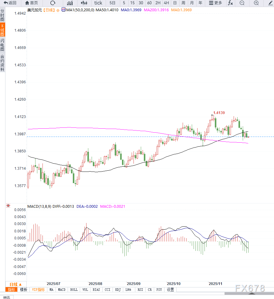 在加元方面,市场关注周五将公布的加拿大11月就业数据。市场预计加拿大失业率将从6.9%升至7%,总体劳动力人数预计保持持平。这一预期使加元短线缺乏主动买盘动力,但油价企稳为加元提供一定支撑,使USD/CAD维持区间运行格局。