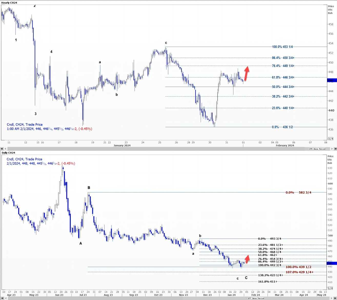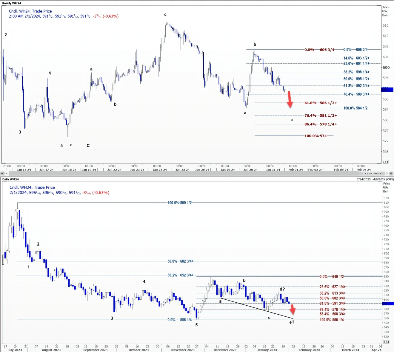 受c波推动,CBOT 3月小麦WH24可能重回1月30日每蒲式耳5.8450美元的低点。