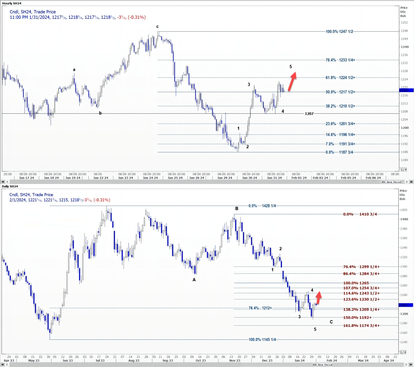 日线图上,自2023年12月18日高点13.4075美元开始的五浪周期可能已经完成。该合约预计将上涨至12.4350美元附近的4浪峰值。