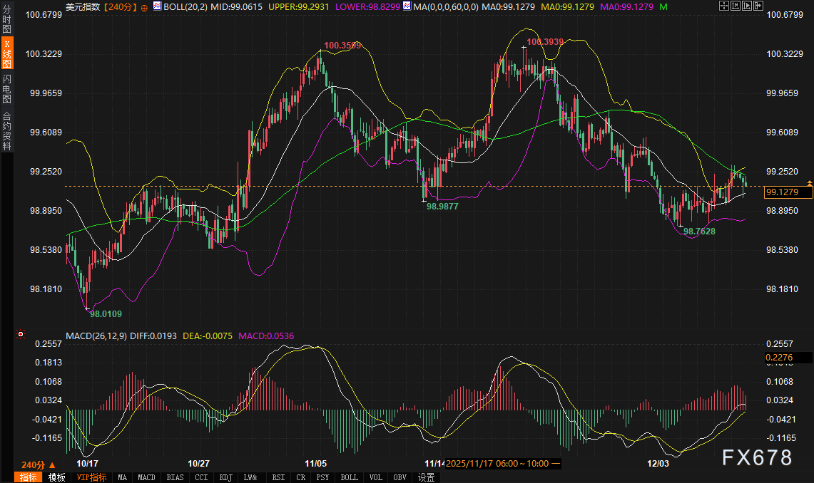 从技术角度审视,美元指数4小时图布林带三轨(上轨99.298,中轨99.064,下轨98.829)呈现收窄走平态势,价格目前徘徊于中轨附近,MACD在零轴附近纠缠,显示多空力量暂时平衡。未来2-3日,决议后的市场反应将成为主导。关键支撑区间关注布林带下轨98.83附近及前期重要心理关口98.50;上方阻力则首先观察布林带上轨99.30,若突破则可能测试99.50-99.80区域。盘中需密切关注美债收益率的即时反应与鲍威尔讲话基调的联动,任何关于通胀前景担忧或放缓降息步伐的暗示,都可能通过推高美债收益率而对美元构成短期支撑;反之,若联储对经济下行风险表露更多关切,则可能打压收益率并拖累美元。