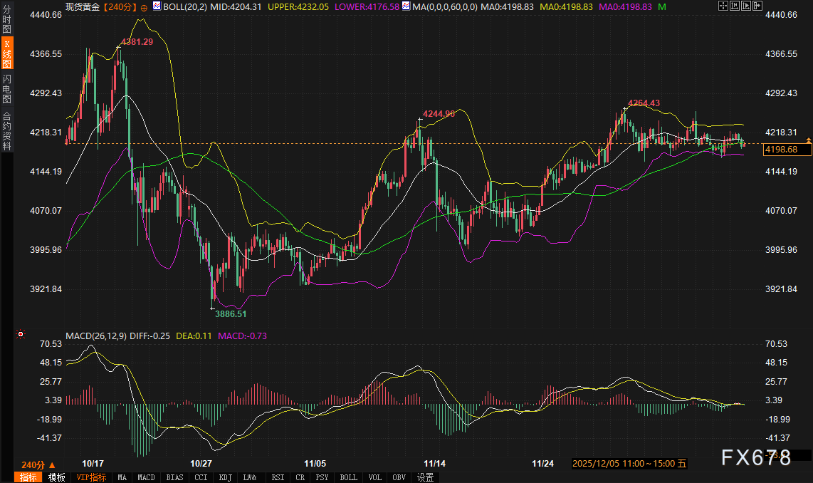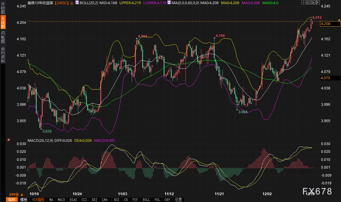 当前市场定价显示,美联储本次会议降息25个基点的概率高达88%,这几乎已成为共识预期。然而,近期债券市场的表现却与宽松预期背道而驰。10年期美债收益率已升至三个多月来的最高水平,技术面上,其4小时图显示价格运行于布林带上轨(4.219%)与中轨(4.168%)之间,MACD双线位于零轴上方,暗示短期上行势头仍在延续。美债收益率的意外坚挺,一方面可能反映了市场对通胀黏性的持续担忧,另一方面也部分消化了“鹰派降息”的可能性——即联储在降息的同时,传递出对后续宽松步伐趋于谨慎的信号。