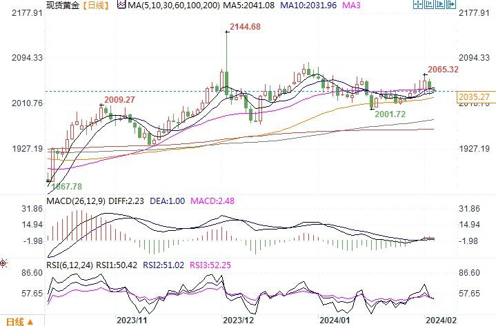 金价在周一(2月5日)亚洲盘中延续弱势震荡,下探至2032下方附近,正逼近市场所认为的重要支撑区域2030-2028,需关注该支撑测试情况。乐观的美国非农就业报告抑制了3月份降息的希望,这令黄金承压。然而,在中东地缘政治局势持续紧张的情况下,金价的下行空间可能有限。