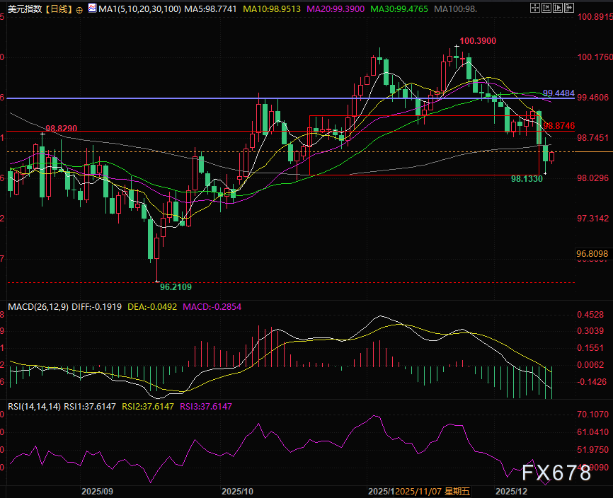 反弹压力位在98.60附近,再往上是98.87,支撑在98.13。