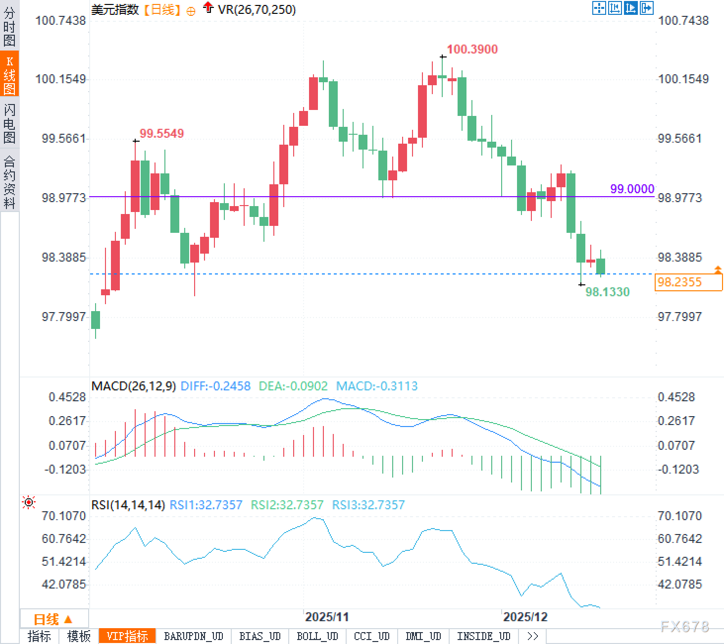 美元指数自上周美联储决议以来持续走软,对主要货币普遍呈现防御态势。技术面显示,美元指数已从11月初触及的100.39高点回落至98.23附近,下跌幅度超过两个百分点。从日线图观察,价格已跌破99整数关口及98.97的重要支撑位,当前正测试98.13附近的前期低点支撑。MACD指标显示DIFF值为负0.2458,DEA值为负0.0902,柱状图持续在零轴下方运行,表明短期动能偏弱。RSI指标读数降至32.73附近,接近超卖区域,但尚未形成明显的底背离信号。