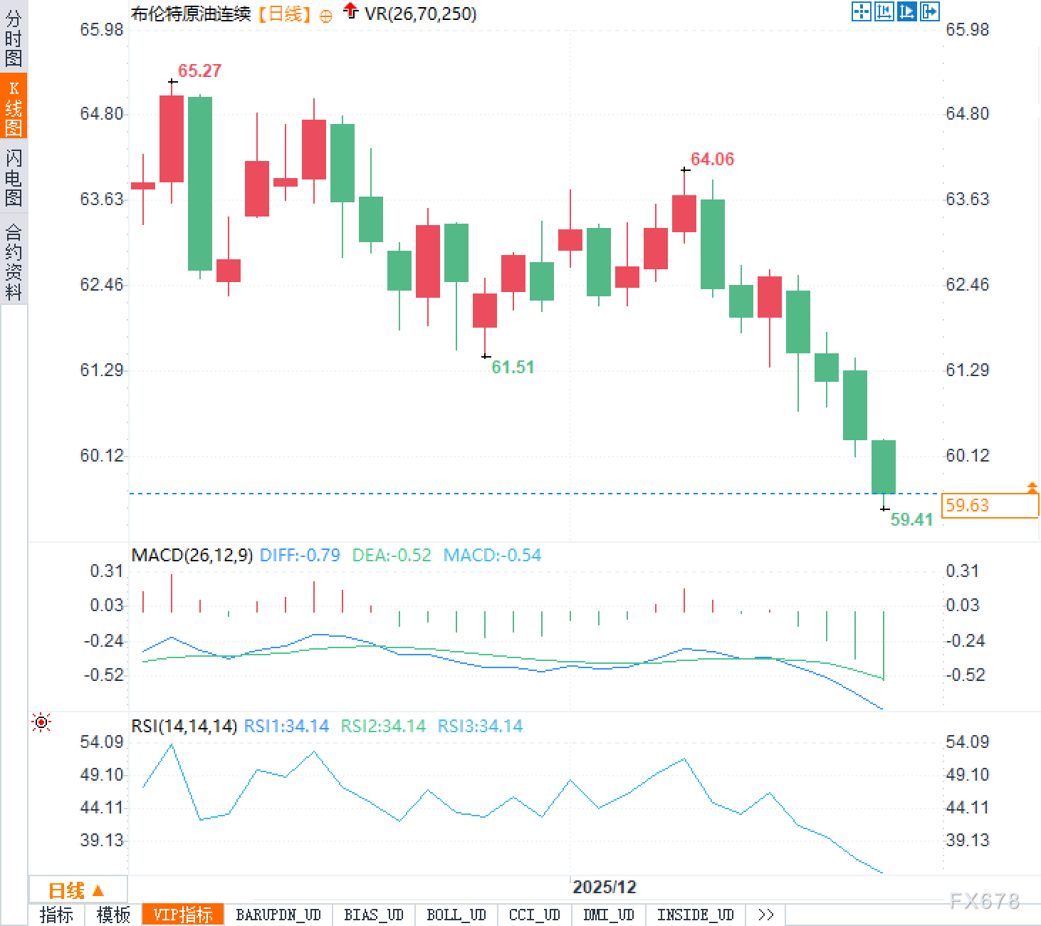 周二(12月16日),布伦特原油延续近两周的单边下行,盘中跌破60美元关口并刷新阶段低点59.41美元,美市盘前报价59.63美元。价格跌至七个多月低位附近,同时美国原油期货也回落到2021年2月以来的弱势区间,显示此次抛压并非局部情绪,而是整个原油复合体在同步下修定价。