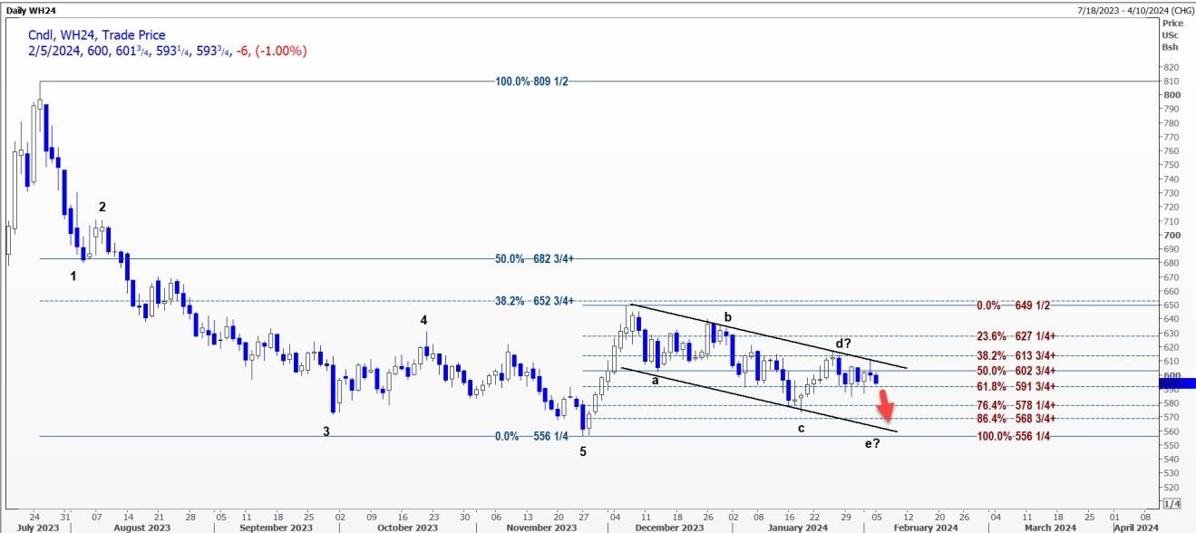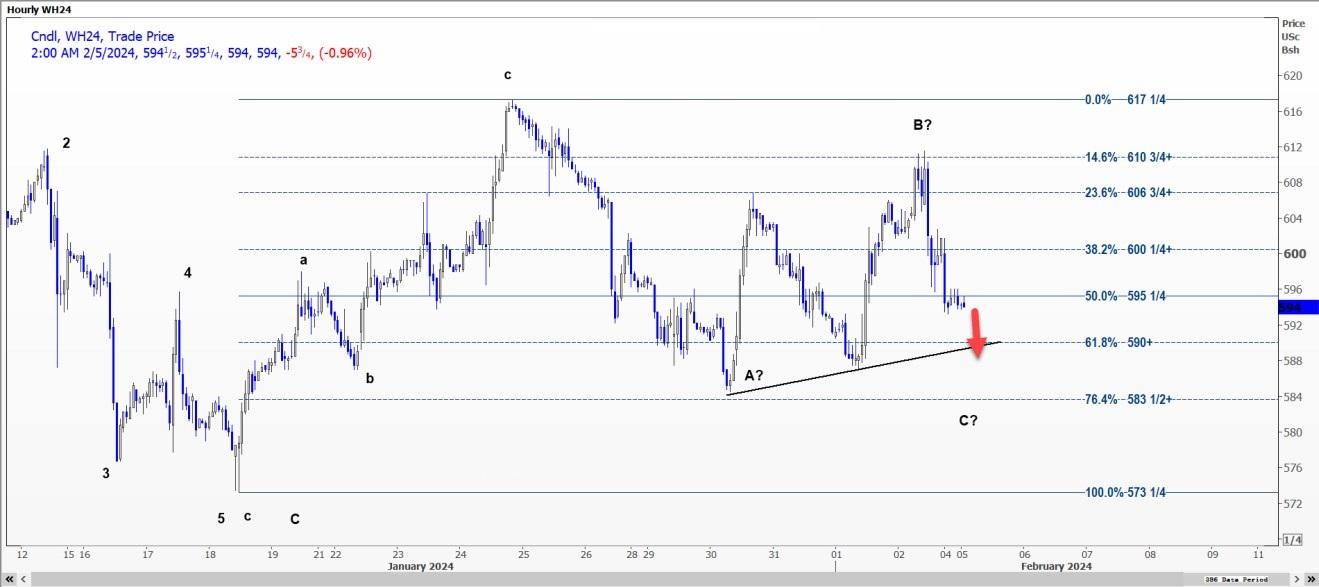 CBOT 3月小麦WH24可能会测试每蒲式耳5.90美元的支撑位,跌破该支撑位后可能会跌向5.8350美元。