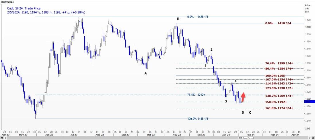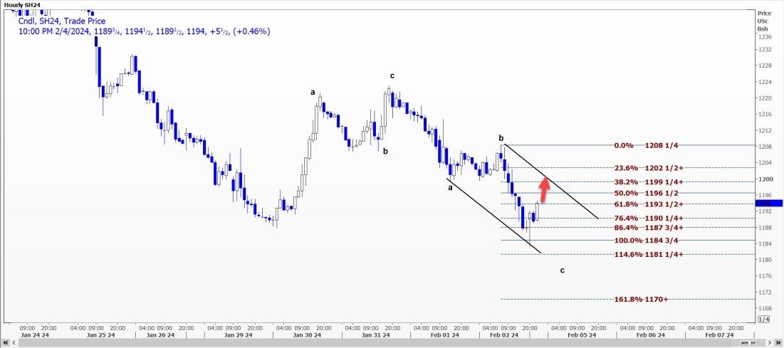CBOT大豆3月合约SH24可能反弹至每蒲式耳11.9650-11.9925美元的区间,因为它在11.8475美元找到强劲支撑。
