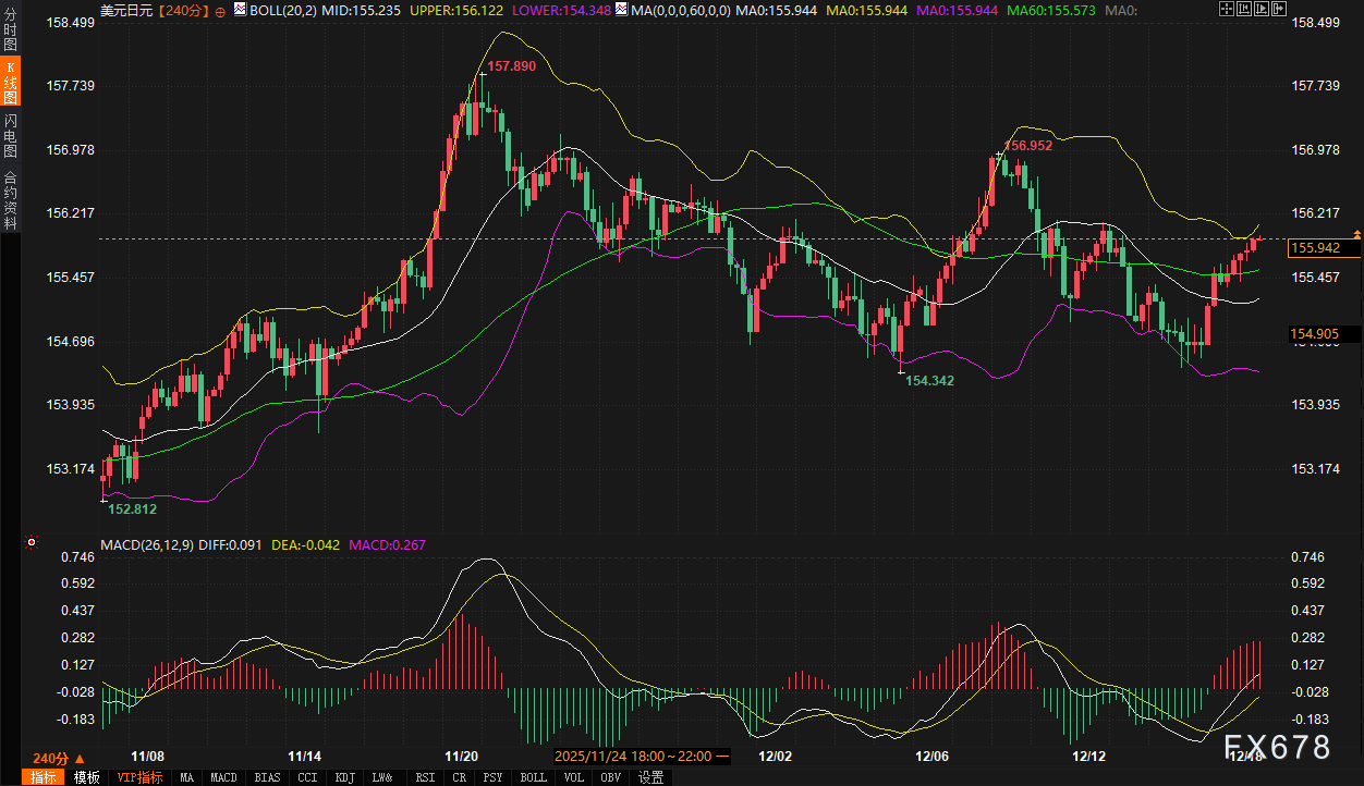 周四(12月18日),全球金融市场将目光聚焦于即将于次日公布的日本央行货币政策决议。市场普遍预期日本央行将时隔数月再次加息25个基点,这一高度一致的预期主导了日债与外汇市场的短期走势。日债市场呈现技术性企稳,10年期日债收益率自高位小幅回落至1.964%附近,较前一交易日下跌0.41%。与此同时,美元兑日元汇率则在155.90上方窄幅波动,日内微涨0.20%,显示出在关键风险事件前,多空双方均保持谨慎。