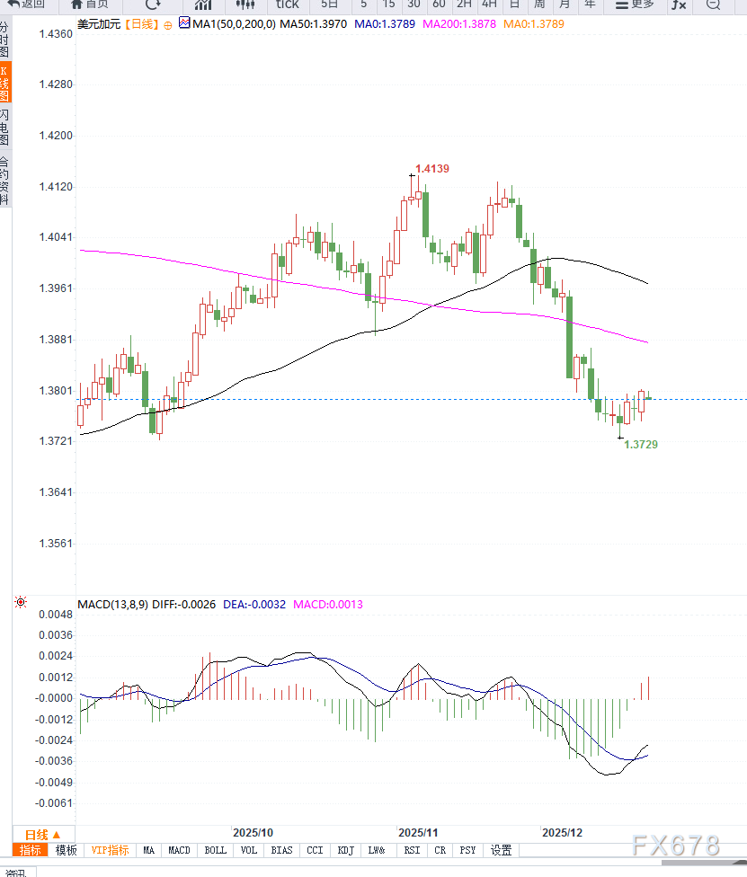 从技术面来看,美元兑加元短线结构仍偏谨慎。汇价虽守在1.3800附近,但整体仍运行在下行的20日指数移动均线下方,反映反弹过程中上方抛压较为明显。20日均线持续下行,显示短期供给压力尚未消退。