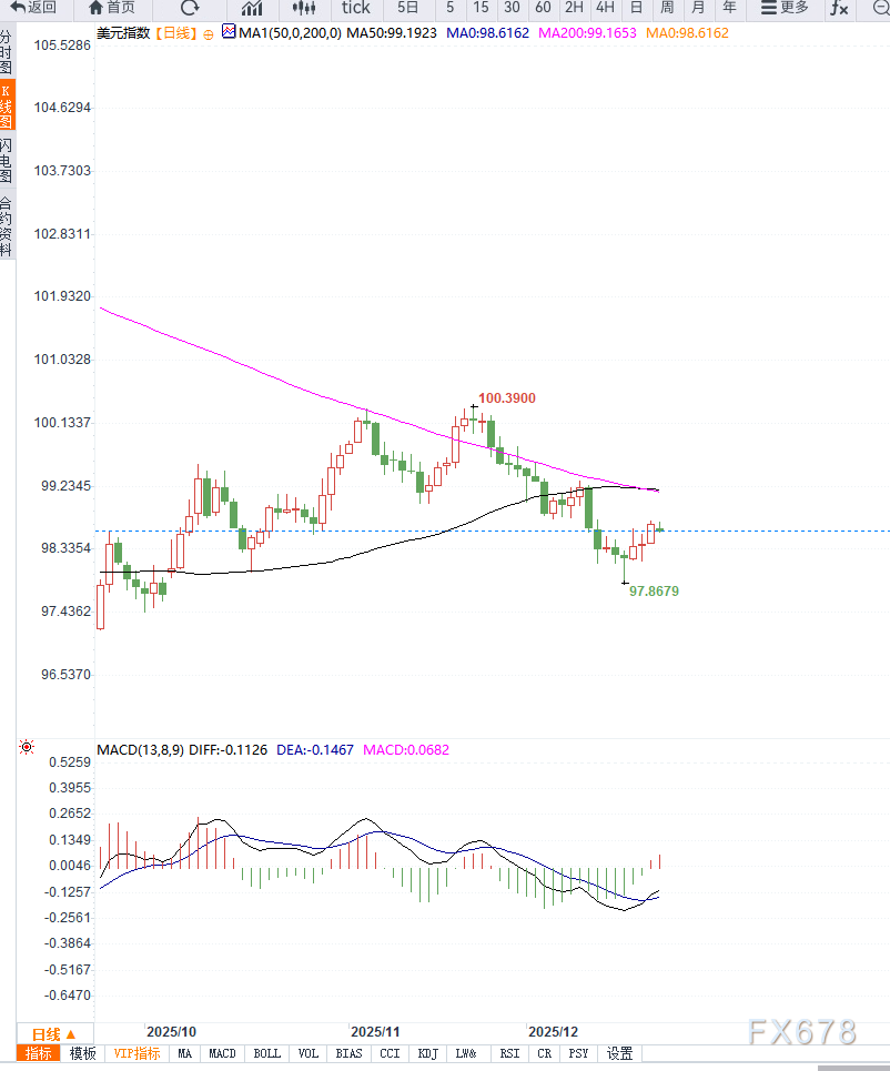 从技术面来看,美元指数日线级别仍处于震荡整理格局。指数此前反弹受阻于99.00附近压力位,目前回落至98.60区间,该区域同时接近日线短期均线,构成初步支撑。