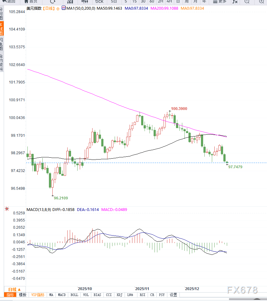 从日线走势来看,美元指数(DXY)已形成清晰的中期下行结构。指数连续多日收阴,并有效跌破前期重要支撑位98.50,同时下探至97.80附近,刷新阶段新低,显示空头占据明显优势。