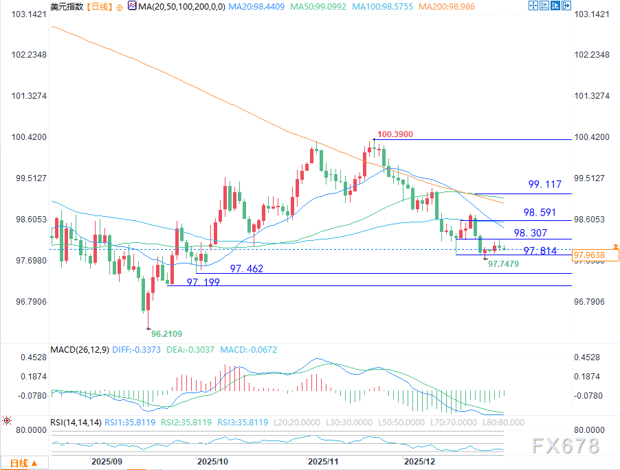 12月10日降息当日,美元指数从日内高点99.256大幅下挫,明确跌破50日均线支撑,随后在12月24日触及短期低点97.749。