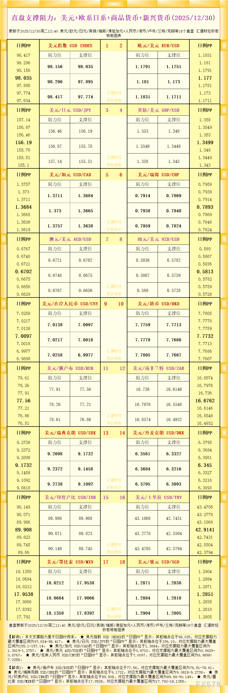 一张图看直盘支撑阻力:美元+欧系日系+商品货币+新兴货币,更新于2025年12月30日周二12:40,具体美元/欧元/日元/英镑/瑞郎/澳纽加元+人民币/港币/卢布/兰特/克朗等18个直盘,更多详见汇通财经析若特制图表中的内容。