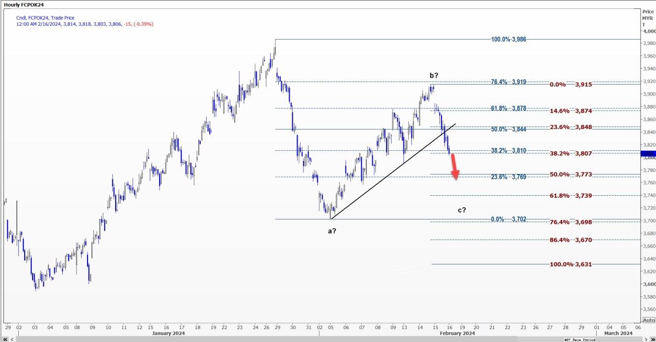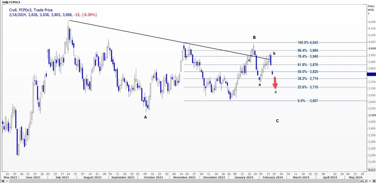 马棕榈油可能会继续下跌至每吨3745-3765林吉特之间。从2月15日高点3965林吉特急剧下跌,表明自1月26日高点4036林吉特以来的下跌趋势可能会延续。