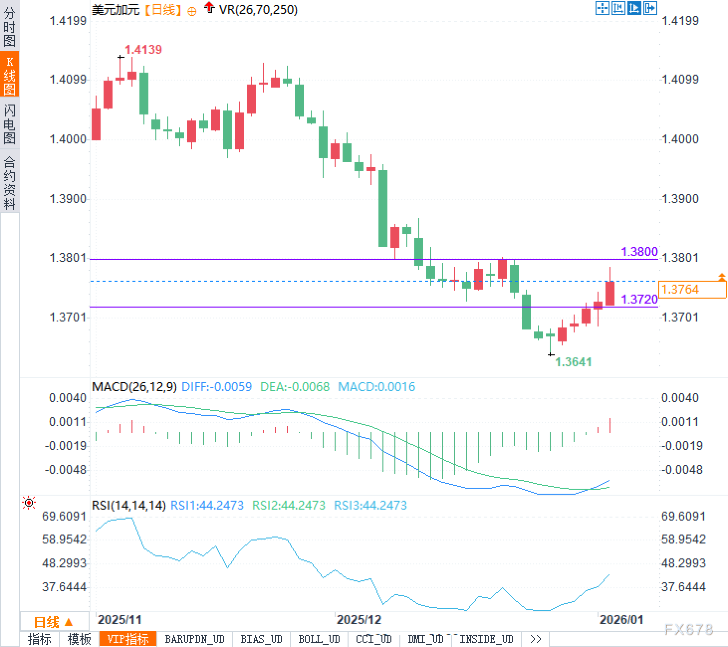 1月5日,星期一。美元整体维持偏强整理,而与大宗商品相关的货币则更容易受到原油与全球增长预期的扰动。美元兑加元欧洲时段在1.3765附近交投,延续自1.3640一线反弹后的修复走势。