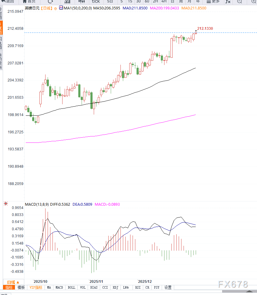技术面来看,日线图显示GBP/JPY维持明显上升趋势,价格稳稳运行于20日指数移动均线(EMA)上方,该均线目前位于210.04附近,构成重要动态支撑。