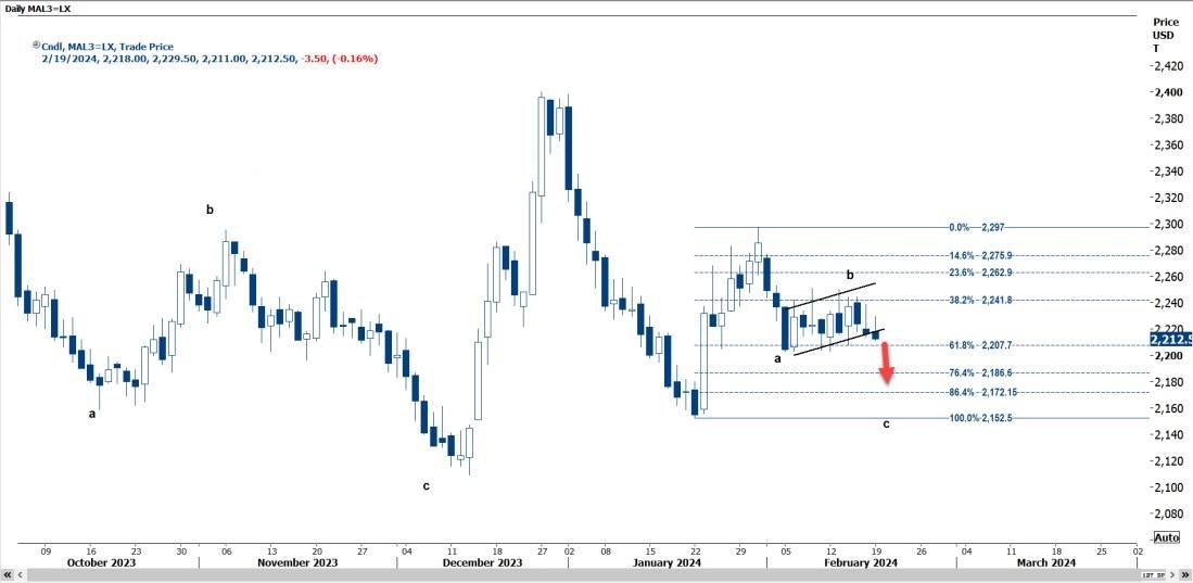 由于价格多次未能突破2242美元的阻力位,因此该支撑位之上的盘整可能已经结束。看跌旗形正在形成,当铝价跌破2008美元时,该旗形将得到确认。