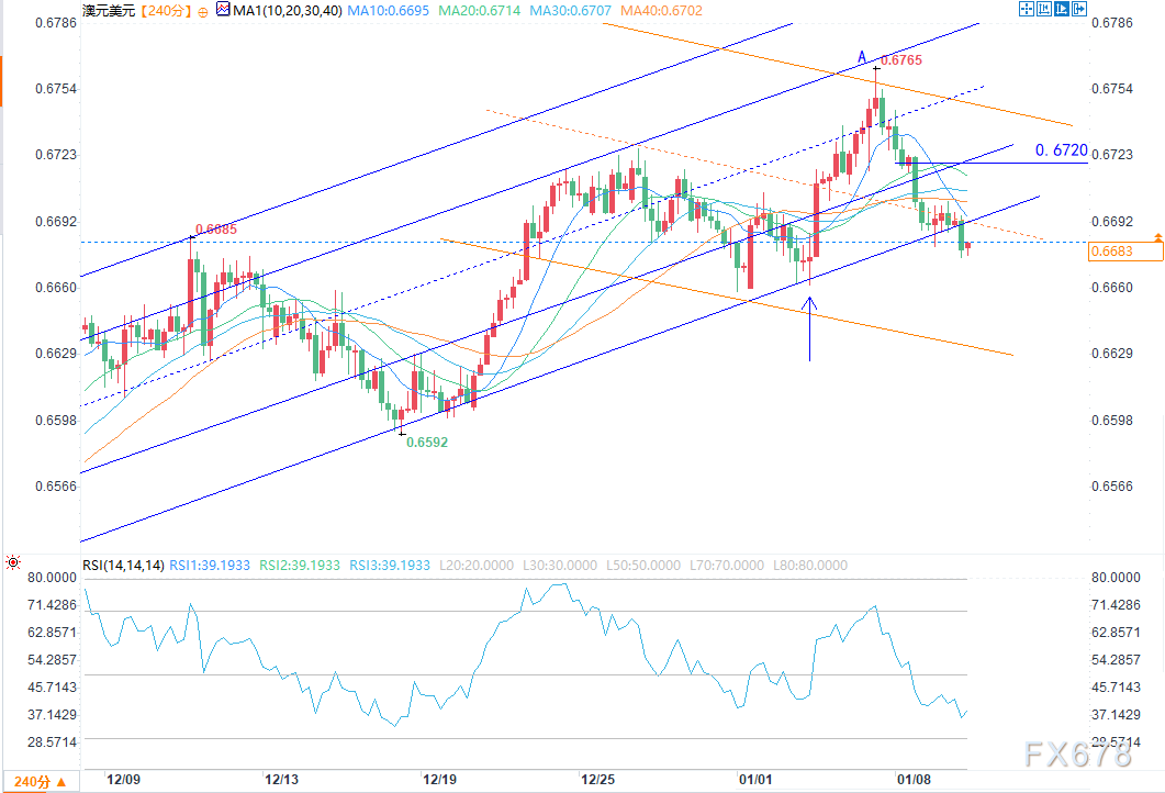 从澳元兑美元走势图来看,澳元盘中跌破0.6680水平,较周三高点(A点)的跌幅超过1.1%。