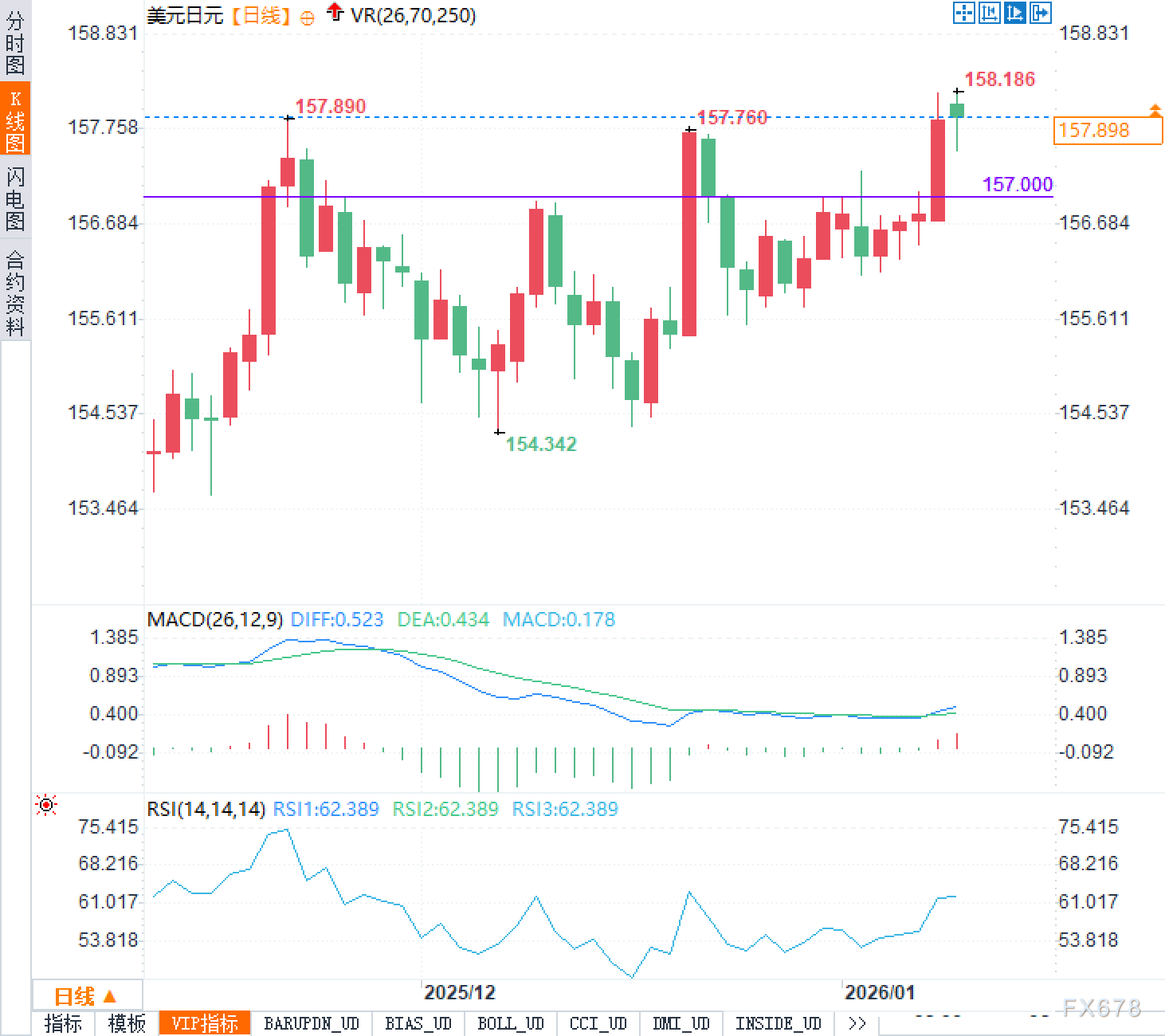 从技术图形来看,美元兑日元的日线结构仍偏向多头。价格多次试探前高区域,最近一次高点标注在158.186,显示出该位置已成为一个明确的心理和技术双重阻力带。下方支撑则集中在157.000一线,这是一个重要的分水岭。若汇价回调不破此位,意味着多头趋势尚未破坏;一旦有效跌破,并进一步下探,则需警惕回调可能扩大至156.50甚至更低水平。
