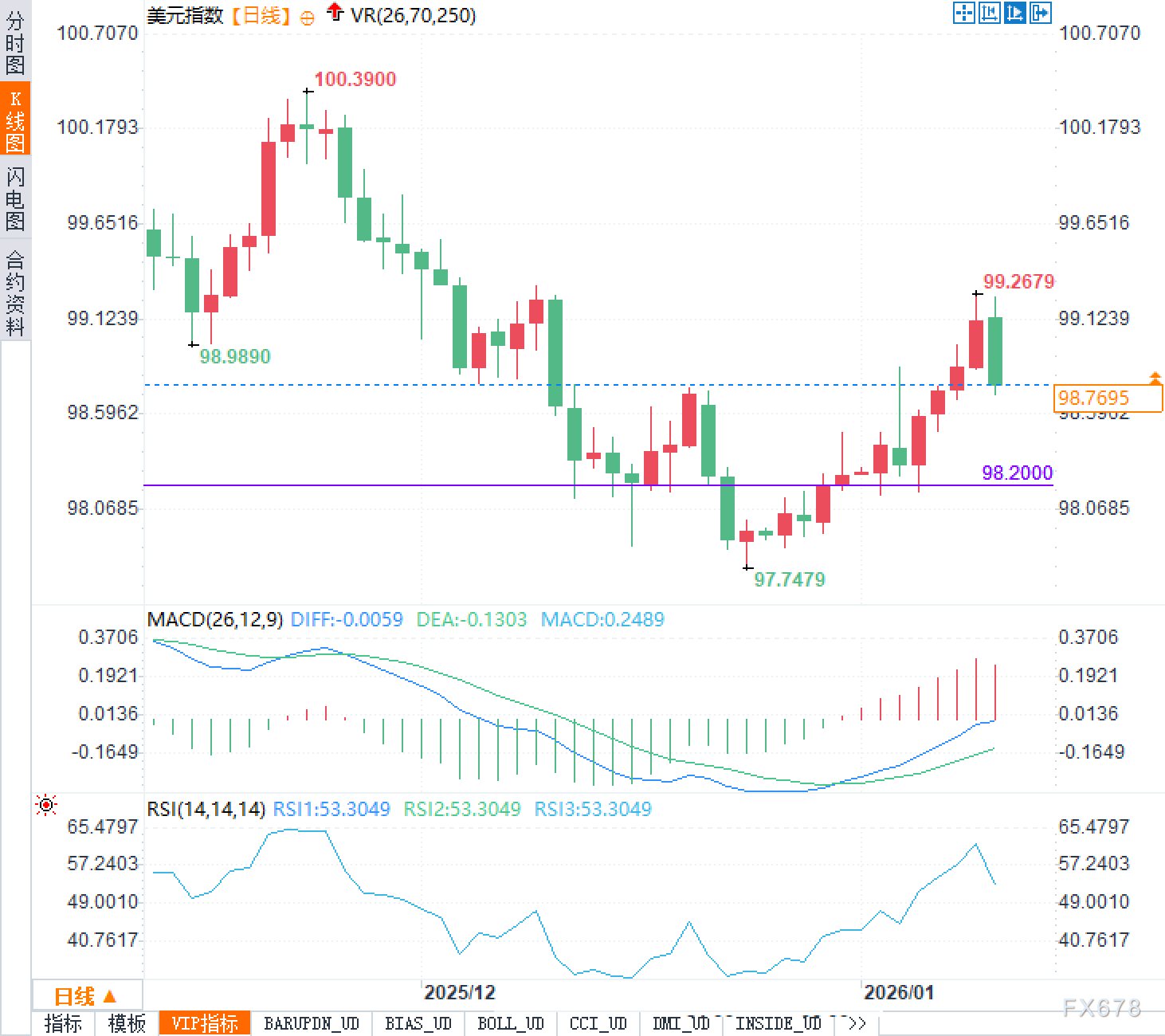 周一(1月12日),美元指数欧洲时段交投98.75附近,此前一度下探至97.7479的低点后企稳回升,随后反弹最高触及99.2679附近遇阻回落。