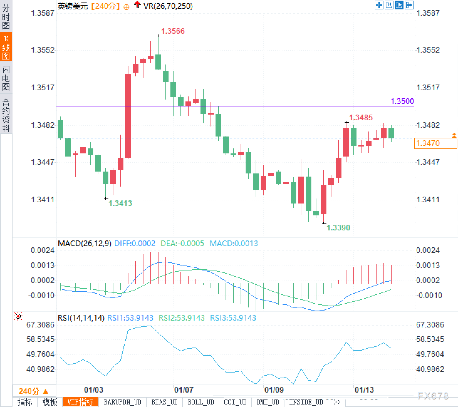英镑兑美元在经历周一的反弹后,周二(1月13日)继续走强,美市盘前交投于1.3470附近。市场情绪整体偏积极,但走势仍受制于上方关键技术位的压制。从图形结构来看,汇价在240分钟级别上正围绕1.3470区域整理,此前曾在1.3390形成阶段性低点,并由此开启反弹。