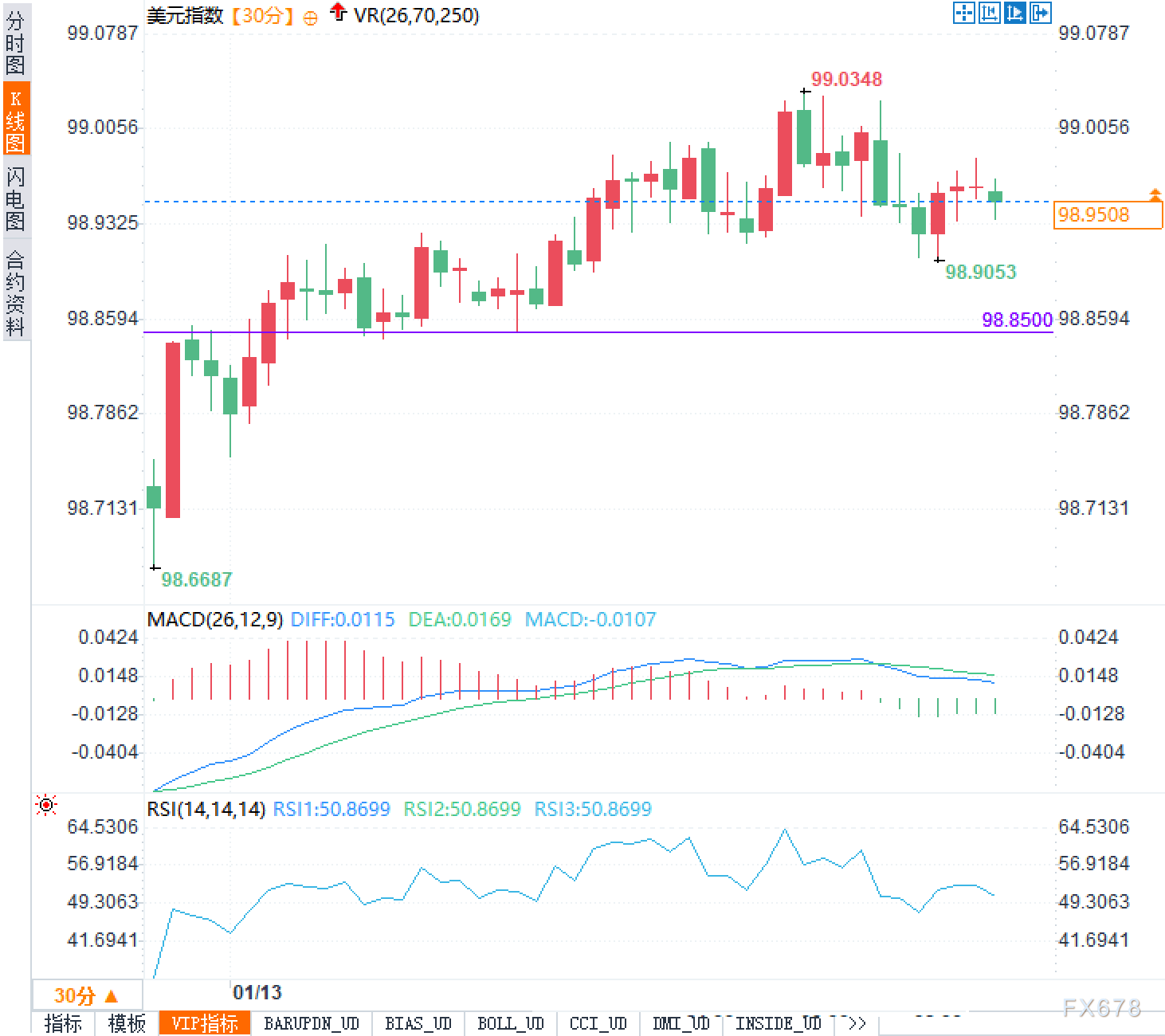 周二(1月13日),美元指数欧洲时段围绕98.95附近窄幅震荡,走势显得犹豫不决。从技术图形看,价格曾在98.6687一线形成阶段性低点后展开反弹,一度冲高至99.0348,但后续动能明显减弱,未能站稳99关口,随即回落至下方整理。